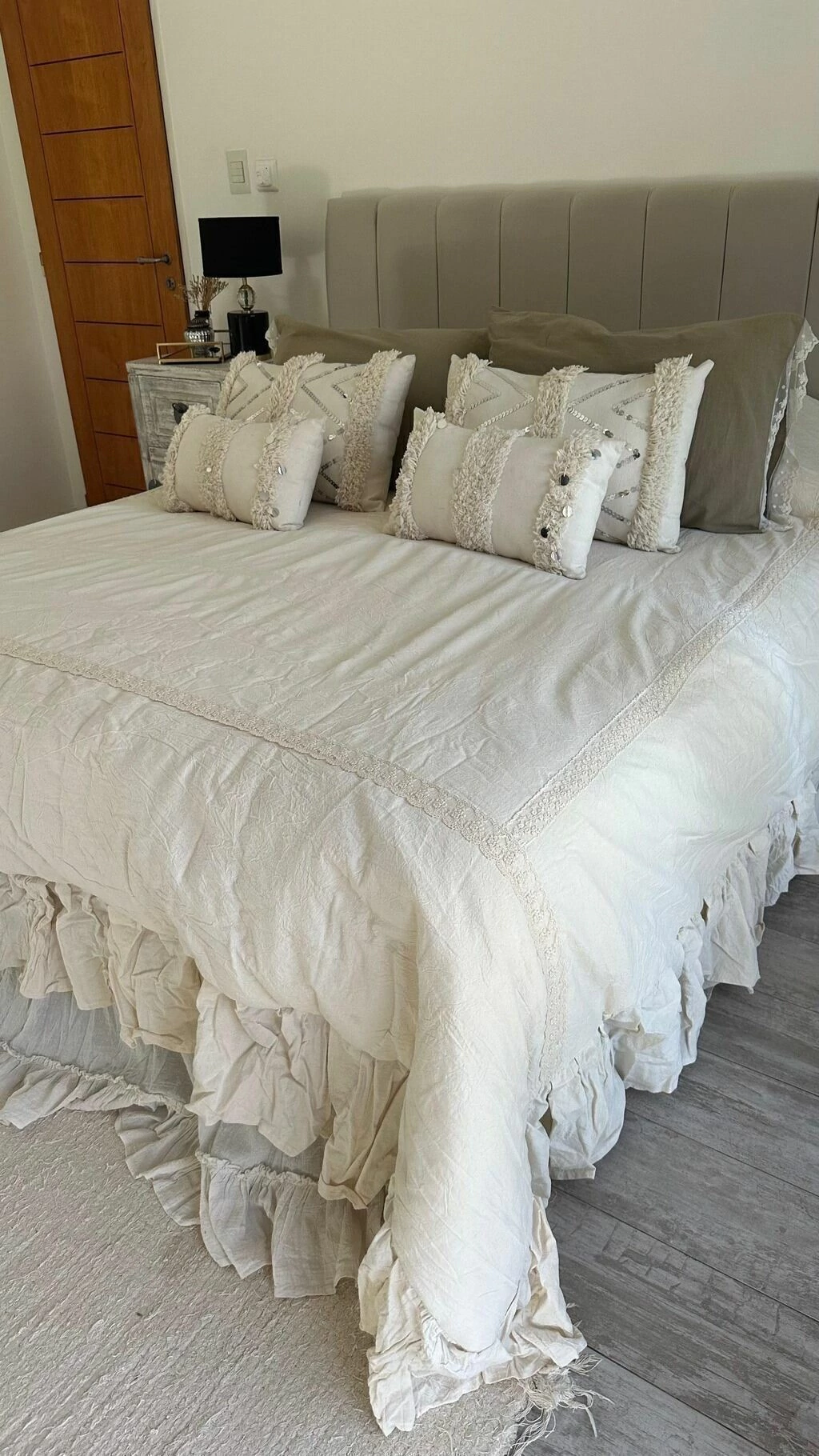 Acolchado realizado en tusor con puntilla y volado, relleno de guata. Color natural.