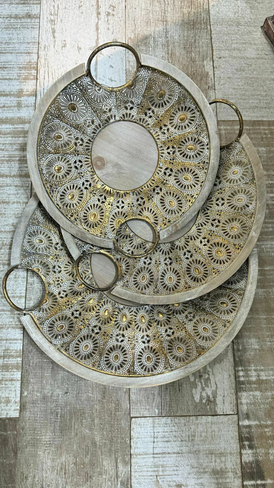 Elegante bandeja de metal redonda con detalle central de madera y asas laterales.