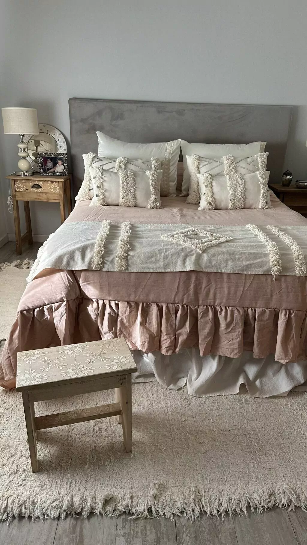 Acolchado realizado en tusor con volado, relleno de guata. Color nude.